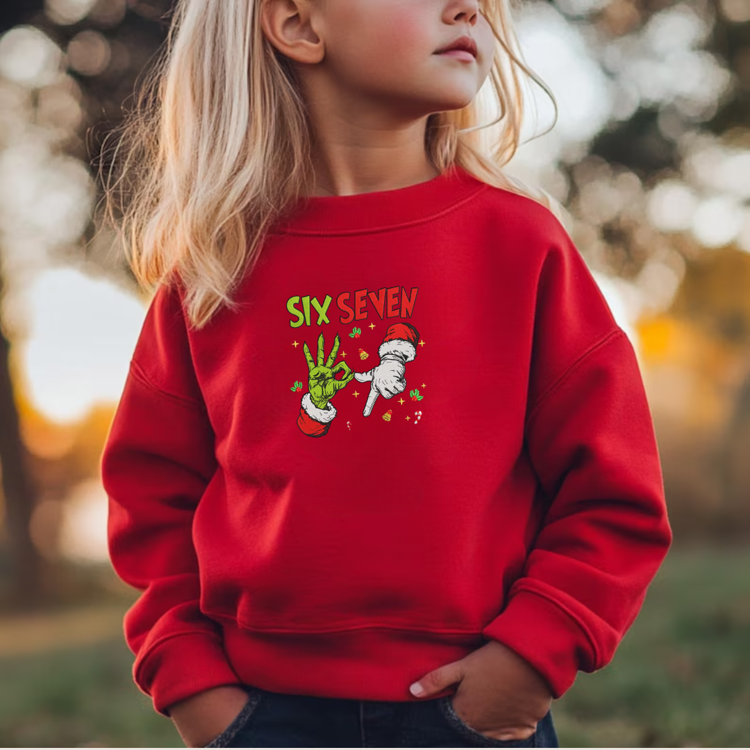 Let your little one join in on the funniest kid trend of the season with our cozy “Six Seven” Holiday Sweatshirt! Featuring a Grinch hand holding up a 6 and a Santa hand holding up a 7, this playful design brings the viral “67” trend to life in the cutest, most festive way.