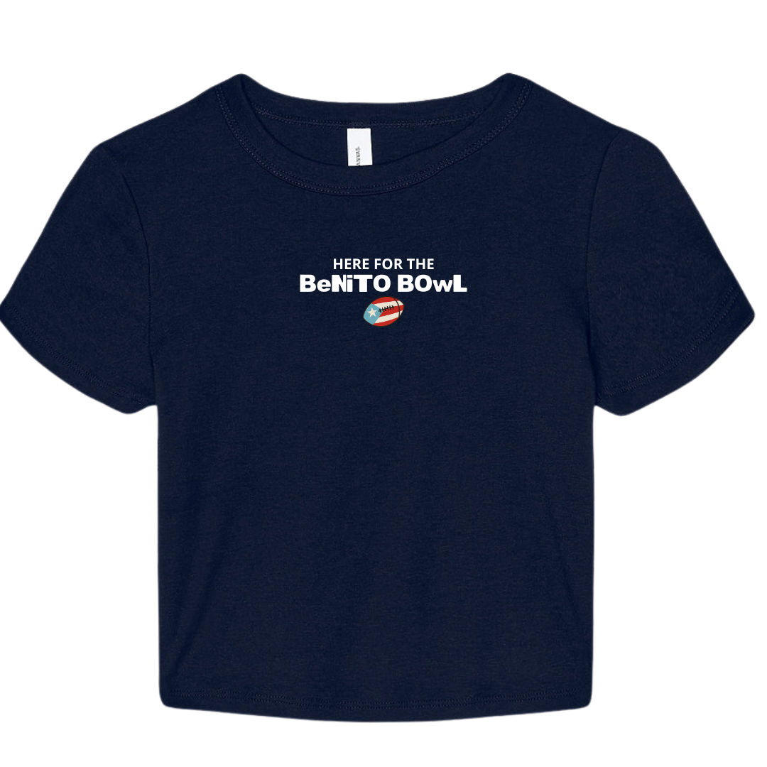 Rep your love for the 2026 Superbowl halftime show in style with this embroidered baby tee! Featuring “Here for the Benito Bowl” stitched on the chest and a football shaded in with the Puerto Rican flag underneath, this cropped tee is perfect for game day, concert nights, or everyday wear. Made from soft, high-quality fabric, it’s flattering, comfortable, and a must-have for any Bad Bunny fan.