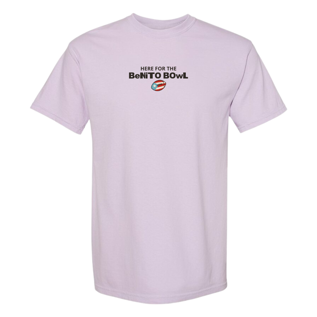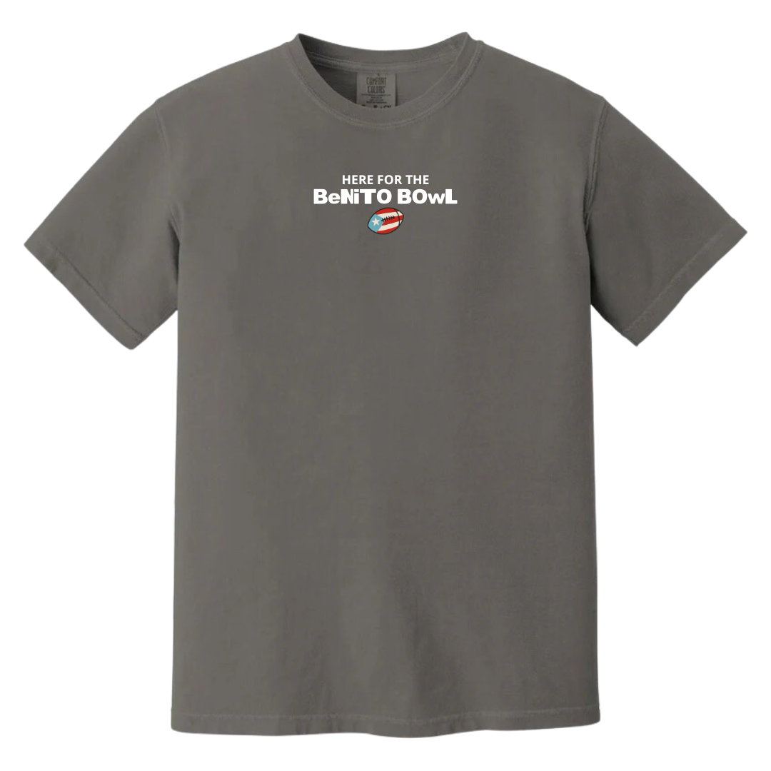 Rep your love for the 2026 Superbowl halftime show in style with this embroidered tee! Featuring “Here for the Benito Bowl” stitched on the chest and a football shaded in with the Puerto Rican flag underneath, this tee is perfect for game day, concert nights, or everyday wear. Made from soft, high-quality fabric, it’s flattering, comfortable, and a must-have for any Bad Bunny fan.