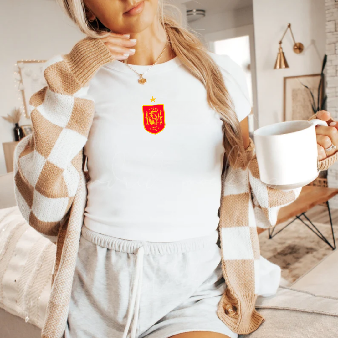 Part of our exclusive World Cup Collection, this fitted baby tee features a detailed Spain national team–inspired crest embroidered at the center of the chest for a clean, powerful, and instantly recognizable look.